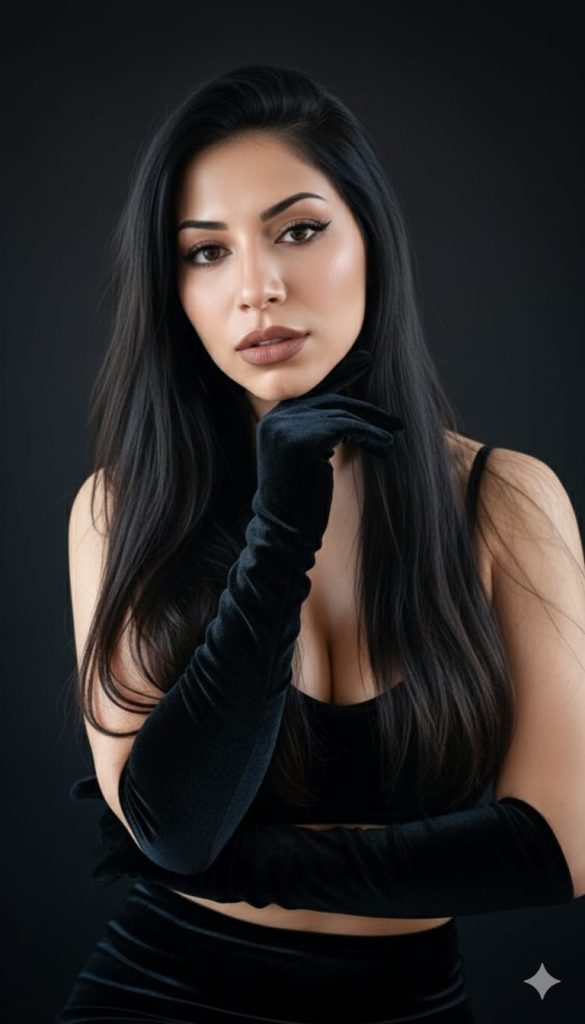 Edita está foto con vestido negro corte V sensual, de tiranrantes semi delgados, y que la foto sea tomada de la cadera hacia arriba, con una pose sensual,Manten los rasgos faciles y aumenta la resolución.El fondo es simple, de color beige monocromático, que va de más claro a más oscuro, con un toque de luz fuerte y una sombra al fondo. La iluminación es suave y dramática, y proyecta un resplandor etéreo sobre ella. La imagen, tomada con una cámara DSLR de alta calidad como una Canon EOS R5 o una Sony Alpha 7R V con un objetivo de 50 mm, tiene un acabado profesional con una profundidad de campo reducida, que hace que el sujeto destaque. La imagen es vibrante y nítida
