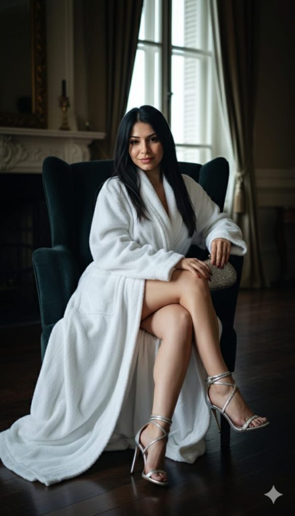Crear una imagen con la foto brindada que la mujer tenga cabello , largo y ondulado, se sienta con gracia en una silla blanca en un estudio luminoso y minimalista, con una suave luz natural que se cuela a través de cortinas transparentes. Lleva una bata de satén color crema con hombros descubiertos, elegantemente drapeada para dejar al descubierto un hombro. Su pose es femenina y relajada, con una rodilla ligeramente levantada y los dedos de los pies tocando el suelo. Al fondo, estatuas blancas que imitan el mármol aportan una atmósfera clásica y artística. El ambiente es suave, elegante y atemporal.