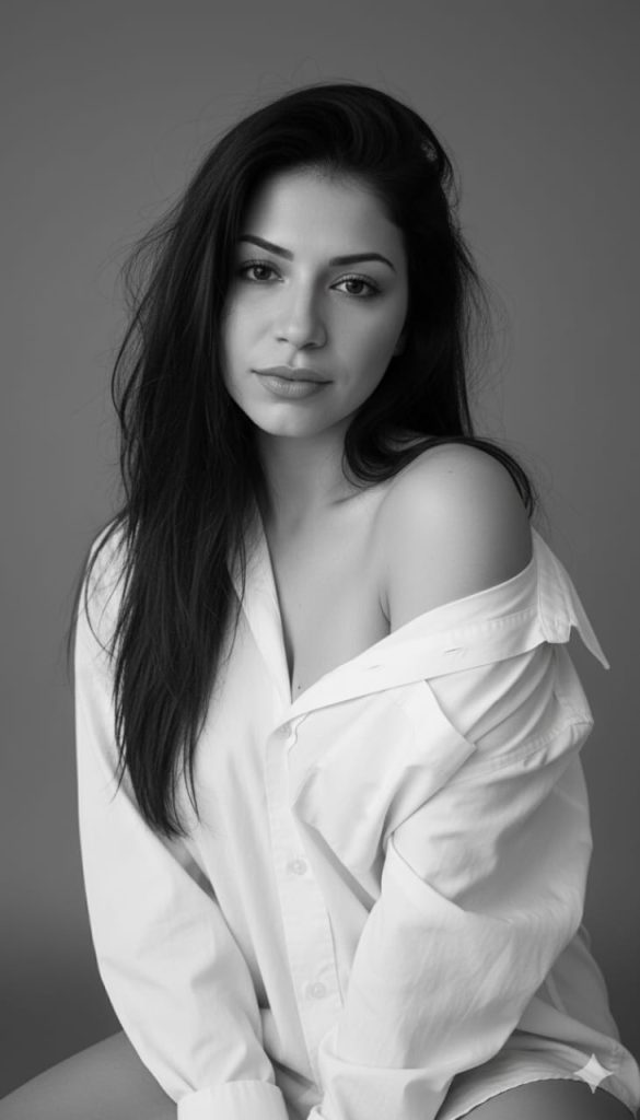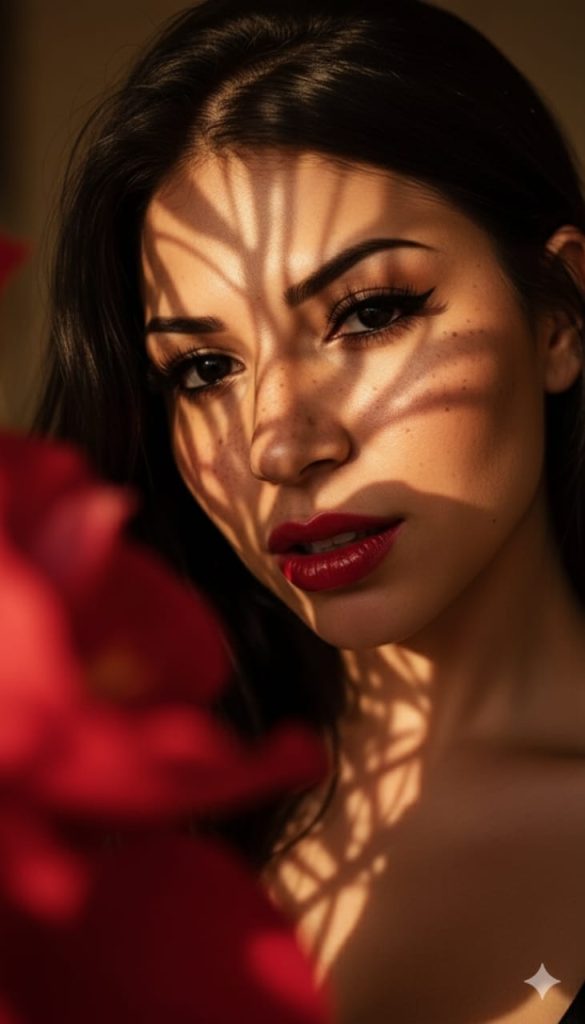 Expressão e pose: Ela gira o rosto em direção à câmera, com o olhar direto mas parcialmente coberto por sombras. Sua boca está levemente entreaberta, acrescentando um ar expressivo e íntimo à imagem. O ombro descoberto e a fina alça de uma peça de roupa, quase imperceptivel, sugerem um retrato artístico, mais sensual do que documental.