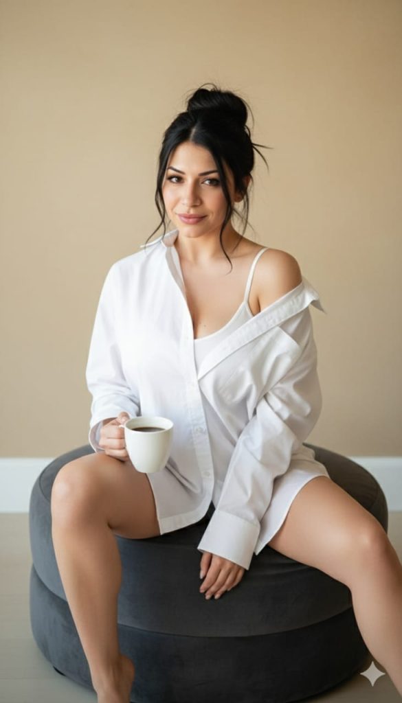 Crea una imagen de la mujer de la foto (mantén los rasgos faciales lo máximo que se te permita) Un primer plano cinematográfico de una mujer joven de cabello largo y negro y apariencia elegante. Lleva una camisa de satén color marfil, de gran tamaño, sin atar y abierta por el cuello. La camisa le cuelga sensualmente de un hombro, revelando parte de su pecho y su clavícula. Un delicado conjunto de joyas de diamantes, que incluye una gargantilla, una pulsera y un anillo, adorna su cuello, muñeca y dedo. Está sentada en el suelo con una pierna doblada hacia arriba y la otra estirada hacia afuera. Una de sus manos, adornada con el anillo de diamantes, se apoya con gracia sobre su pecho, sosteniendo la camisa en su sitio. Su pelo negro está suelto desordenado, con mechones sueltos que enmarcan su rostro. Un maquillaje impecable, que incluye un labio marrón claro y un sutil delineado de ojos, realza sus rasgos. El fondo es simple, de color beige monocromático, que va de más claro a más oscuro, con un toque de luz fuerte y una sombra al fondo. La iluminación es suave y dramática, y proyecta un resplandor etéreo sobre ella. La imagen, tomada con una cámara DSLR de alta calidad como una Canon EOS R5 o una Sony Alpha 7R V con un objetivo de 50 mm, tiene un acabado profesional con una profundidad de campo reducida, que hace que el sujeto destaque. La imagen es vibrante y nítida.